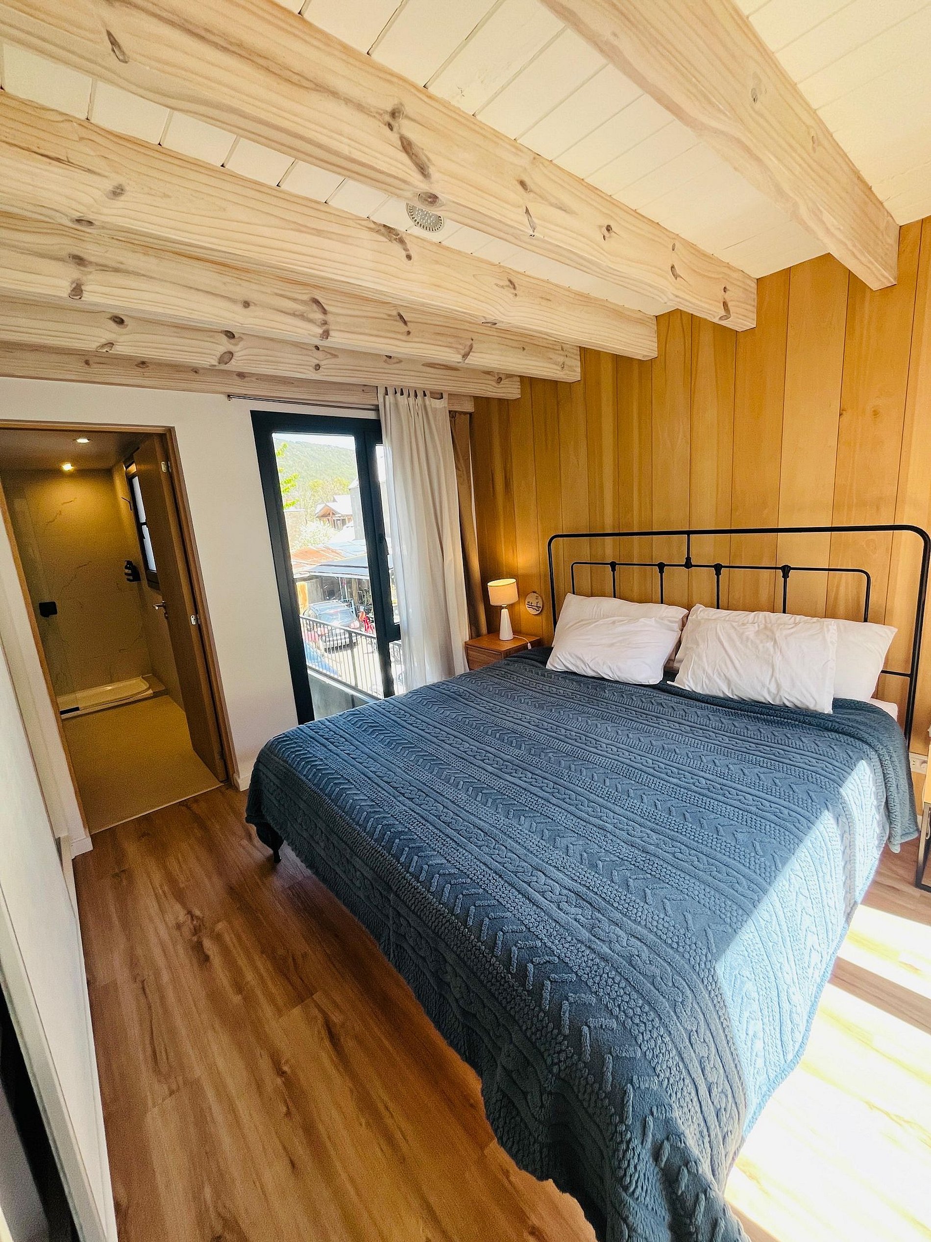 Uno principal con cama matrimonial en suite y un gran ventanal con vista al cerro.