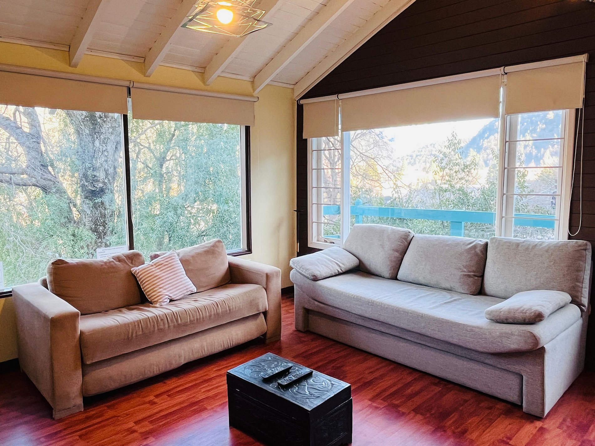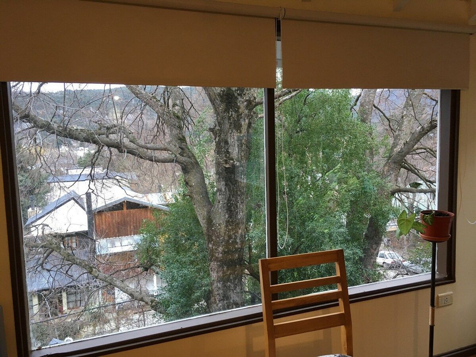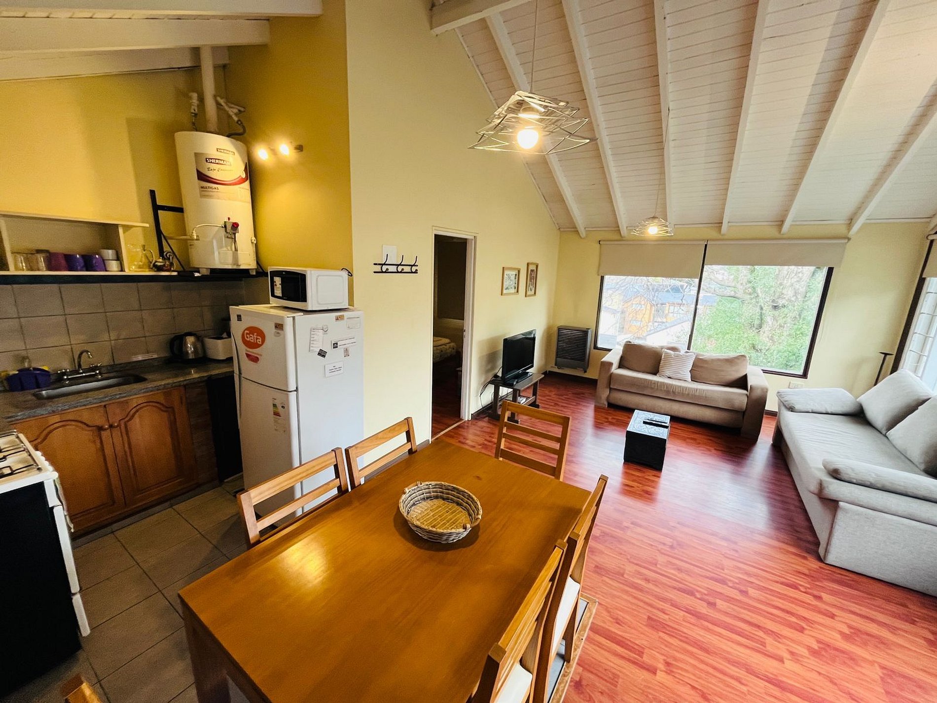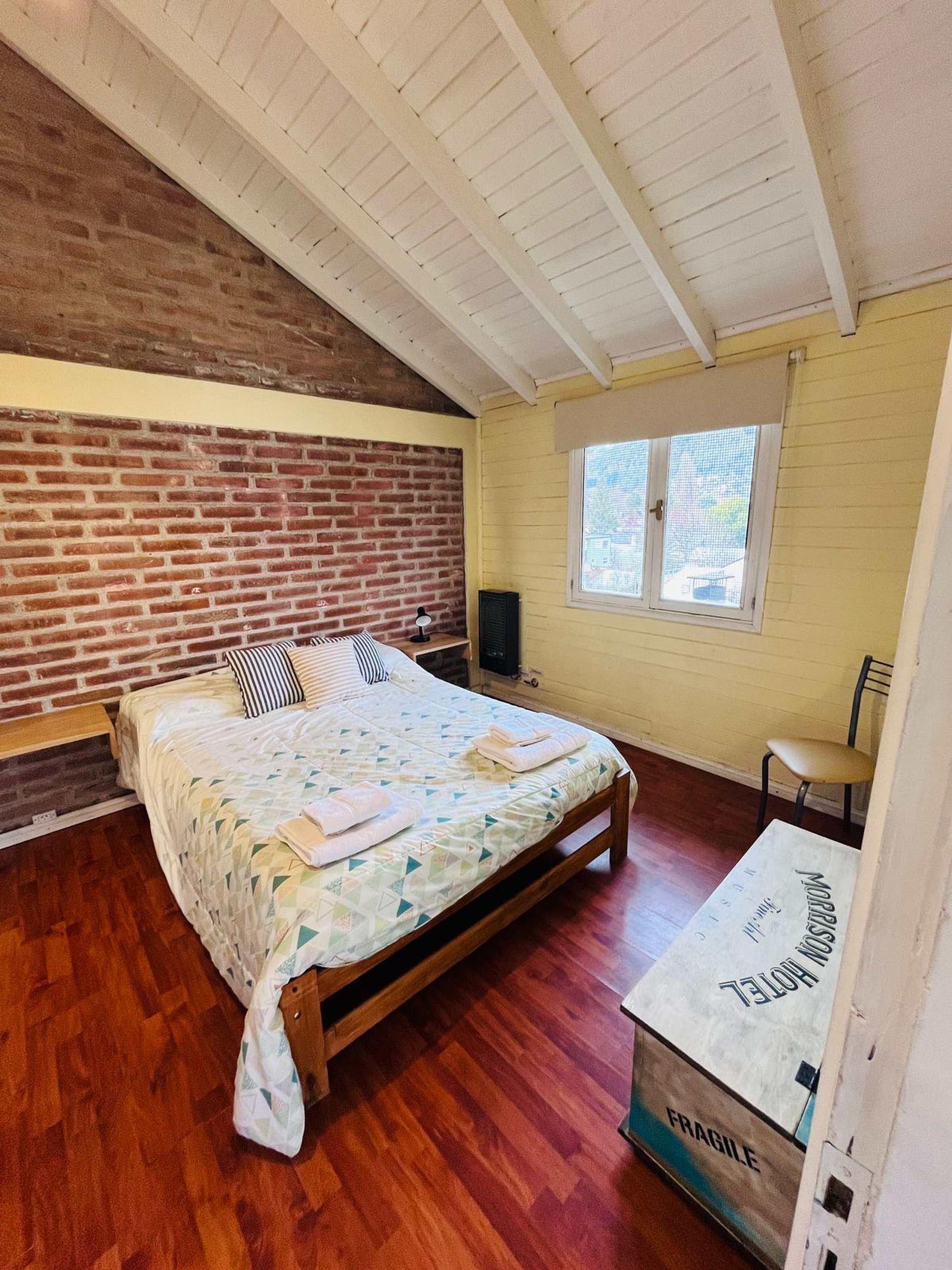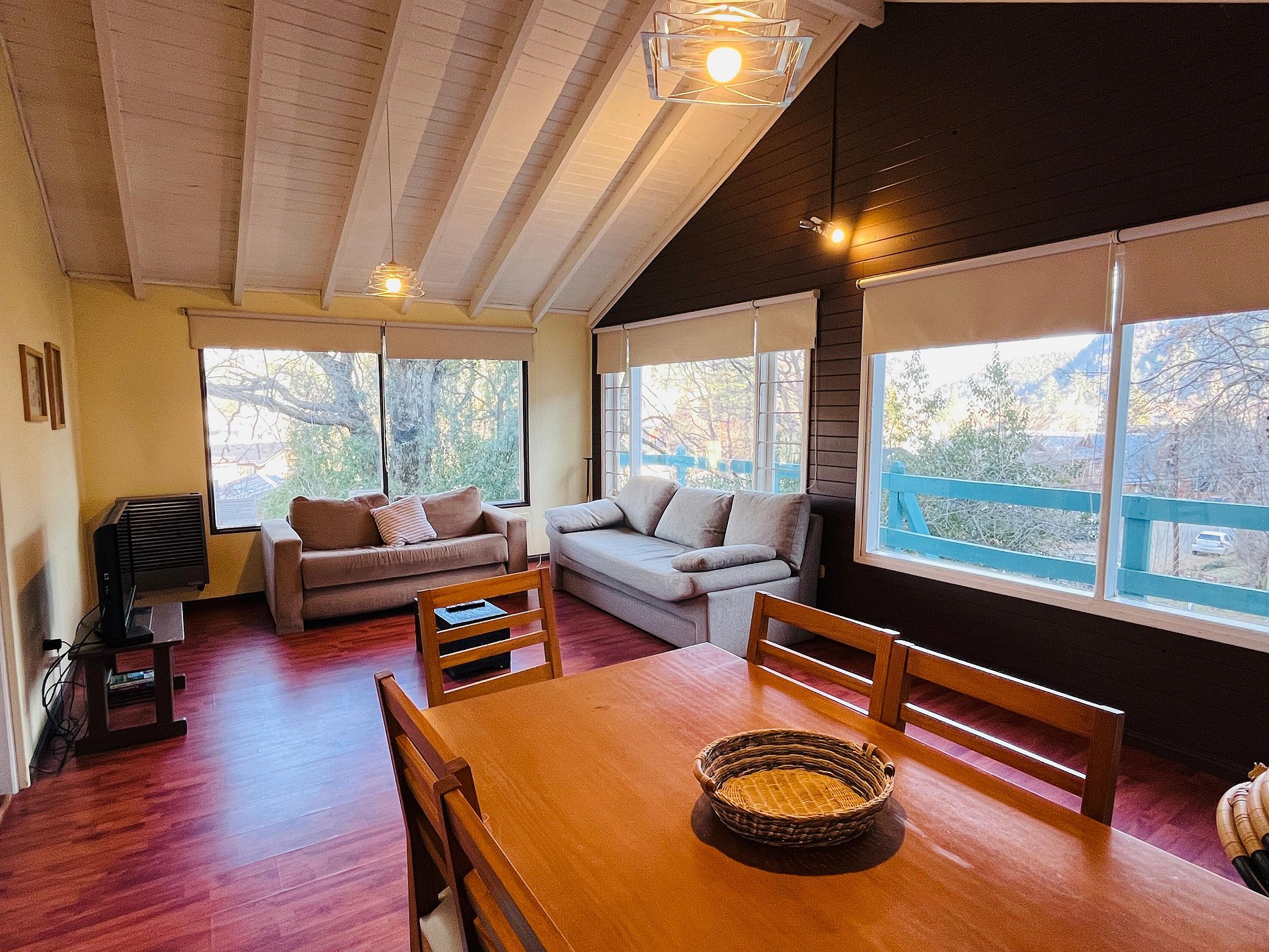 Alquiler cabaña para 4 en el centro de San Martín de los Andes. Cabaña muy luminosa a pocas cuadras de la plaza san martin. Se accede por escalera. Cabaña reciclada a nuevacon amplios ventales y muy lindas vistas a las montañas y al centro. Amplio dormitorio con baño en suite. Cocina totalmente equipada con tostadora eléctrica, cafetera, pava eléctrica y microondas. Vajilla completa para 4 personas. Calefactores a gas tiro balanceado. TV cable y WIFI Estacionamiento descubierto. Mínimo 2 noches