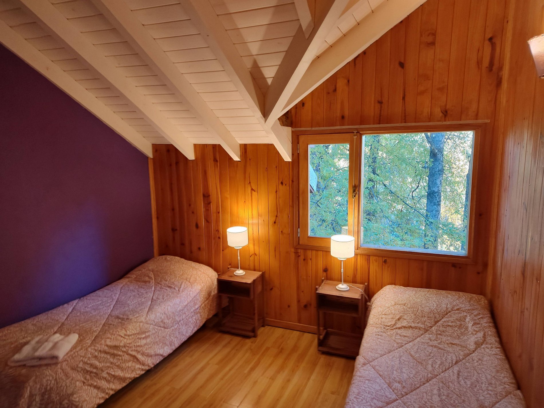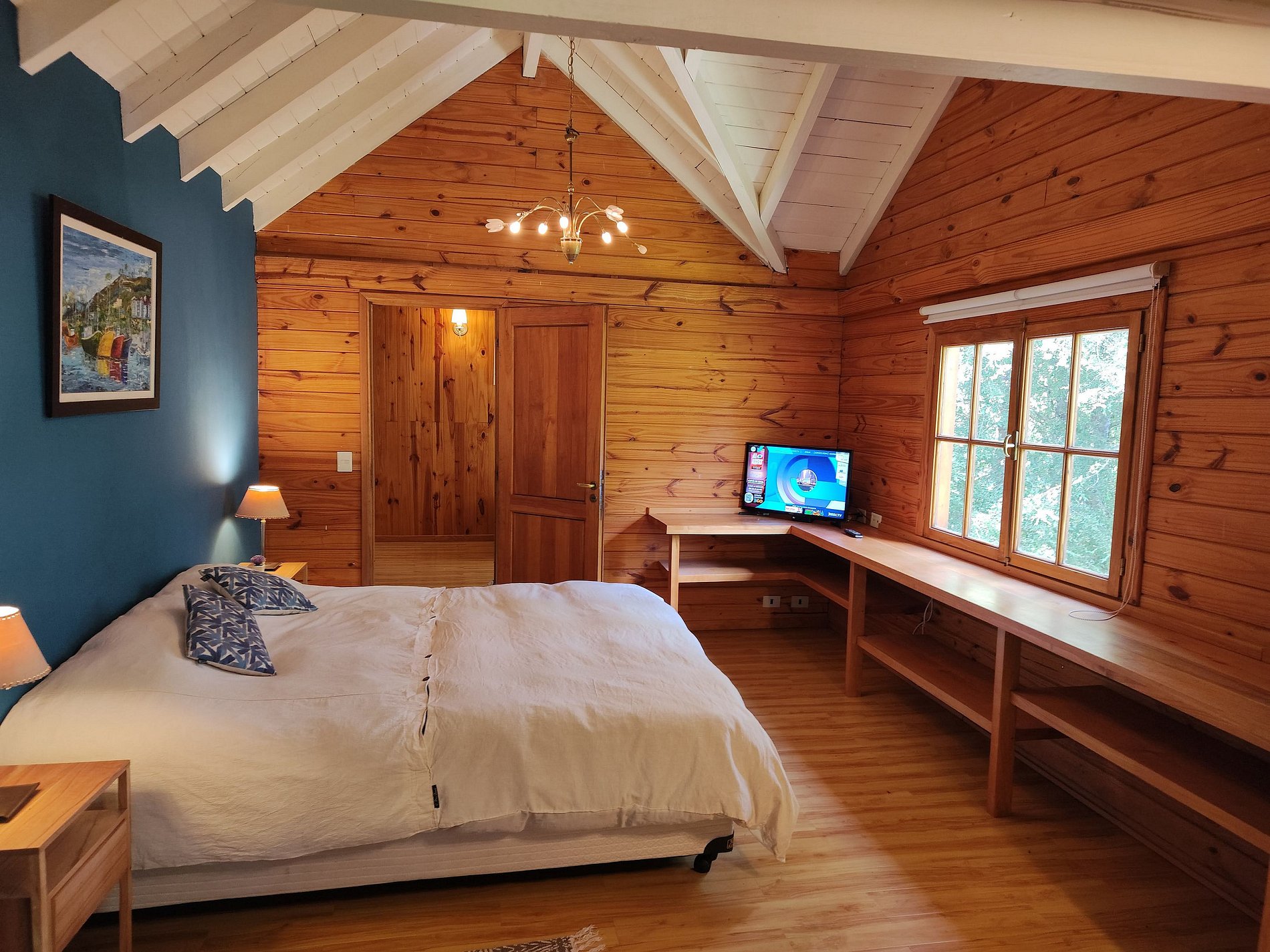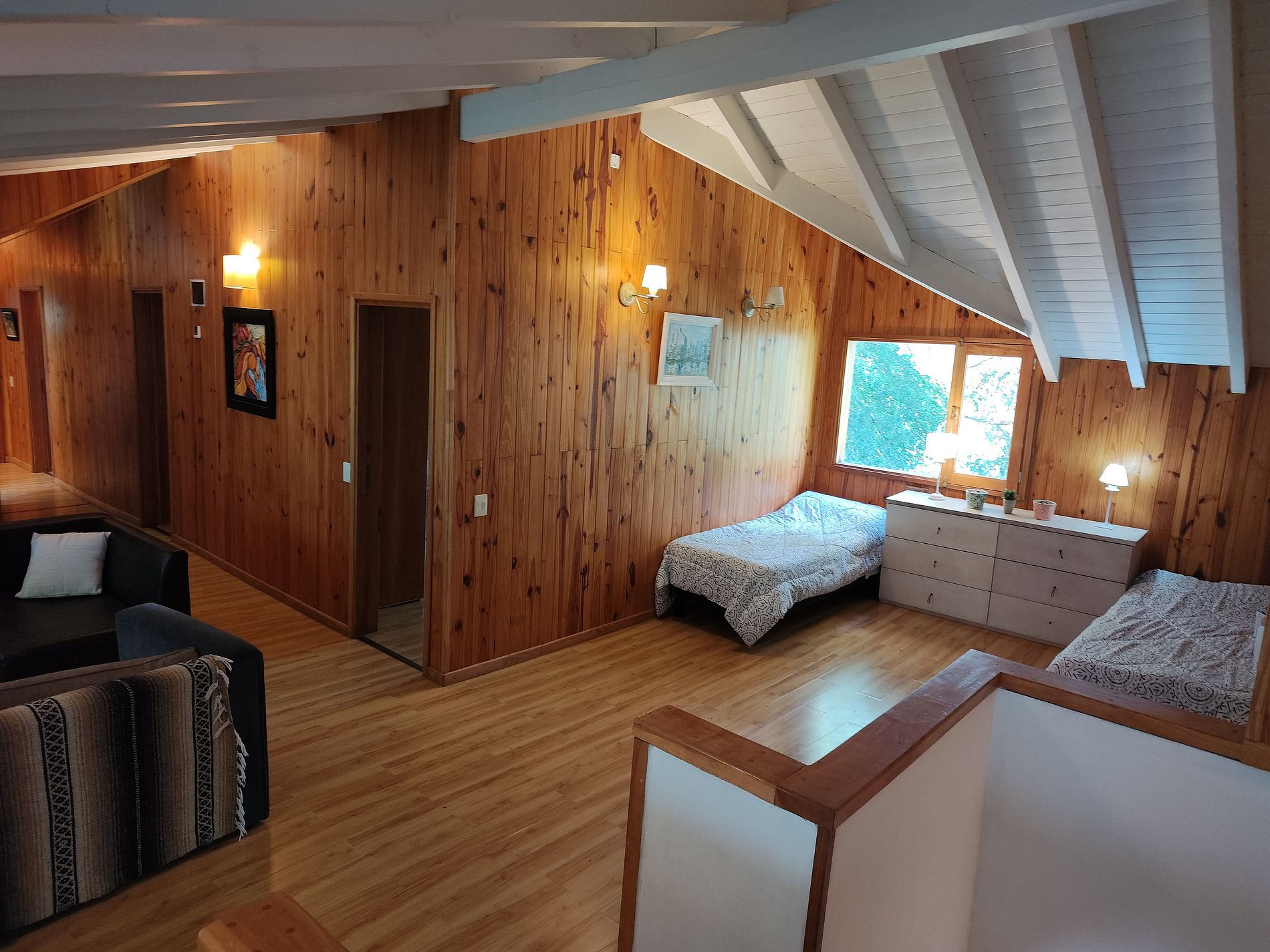 Cabaña a 10 min del centro con 5 dormitorios En PB 1 dormitorio matrimonial con baño completo Cocina totalmente equipada Comedor con hogar a leña, equipo de música Living c amplio ventanal al bosque y hogar a leña Bar Lavadero con lavarropas. 3 habitaciones, cada una con 2 camas de 1 plaza Dormitorio principal en suite sommier 2 plazas, Directv Playroom equipado con TV. Dos camas simples Amplio jardín con hamacas Galería trasera c jardín y parrilla exterior Alarma con monitoreo Losa radiante.