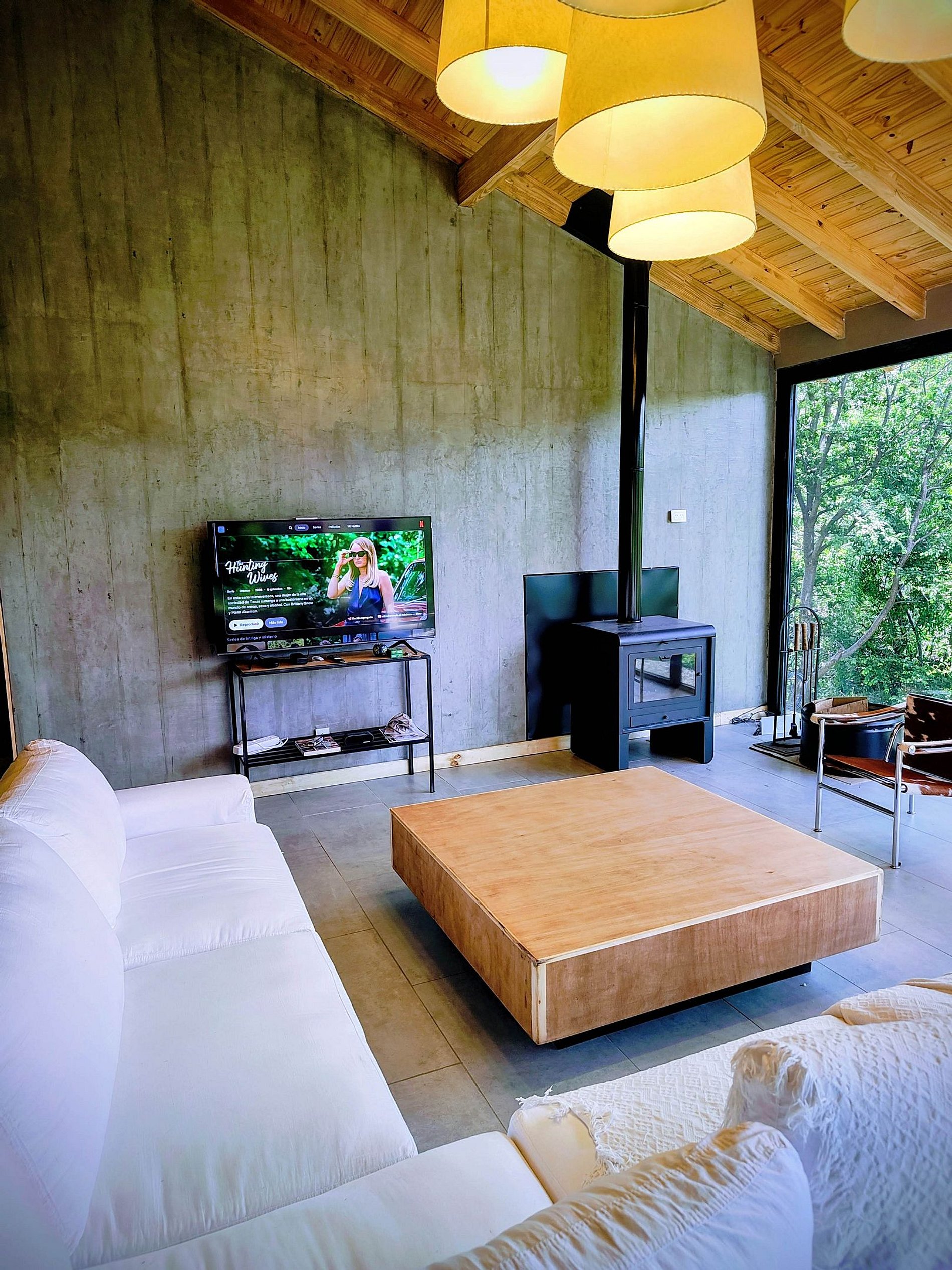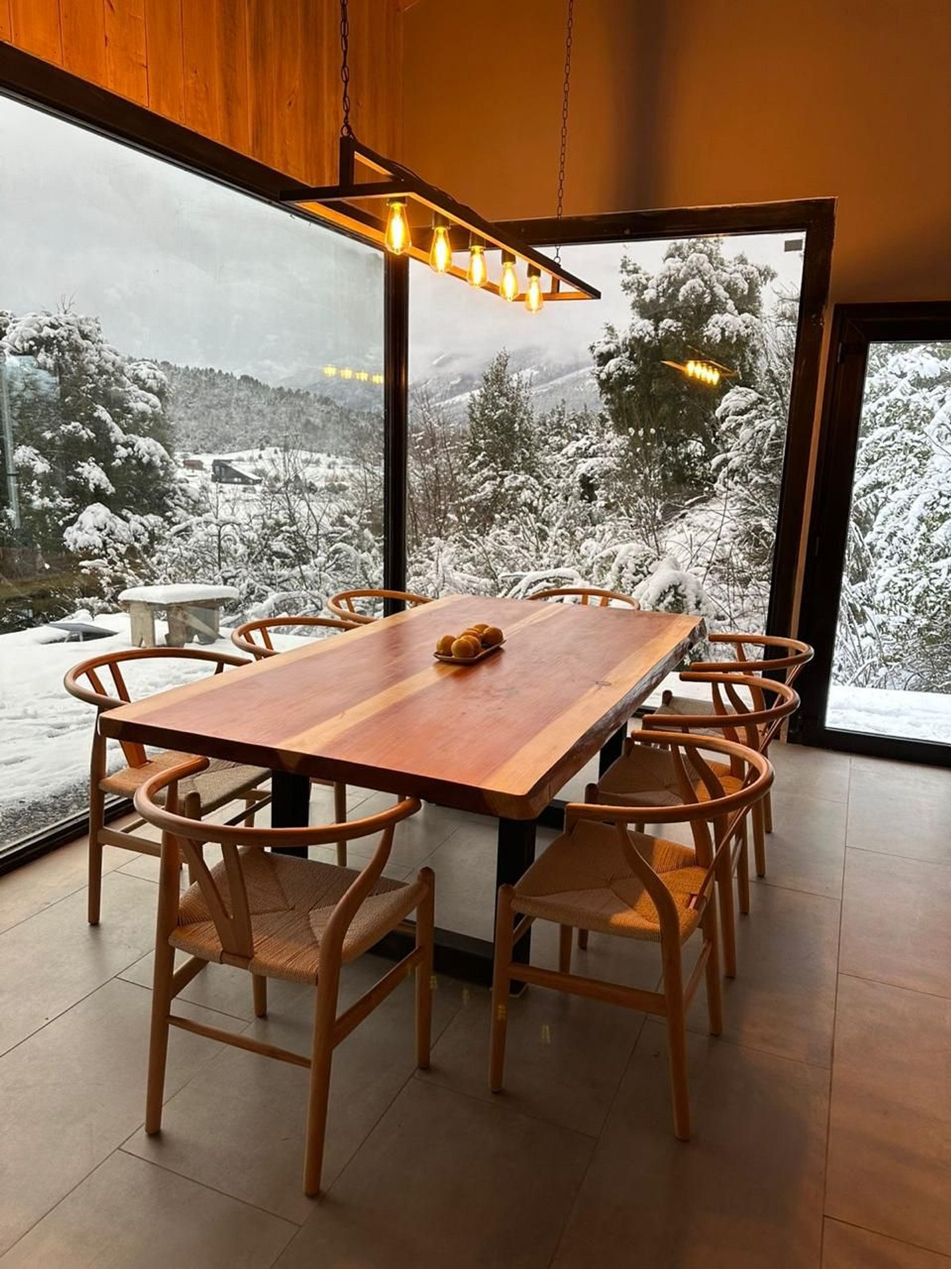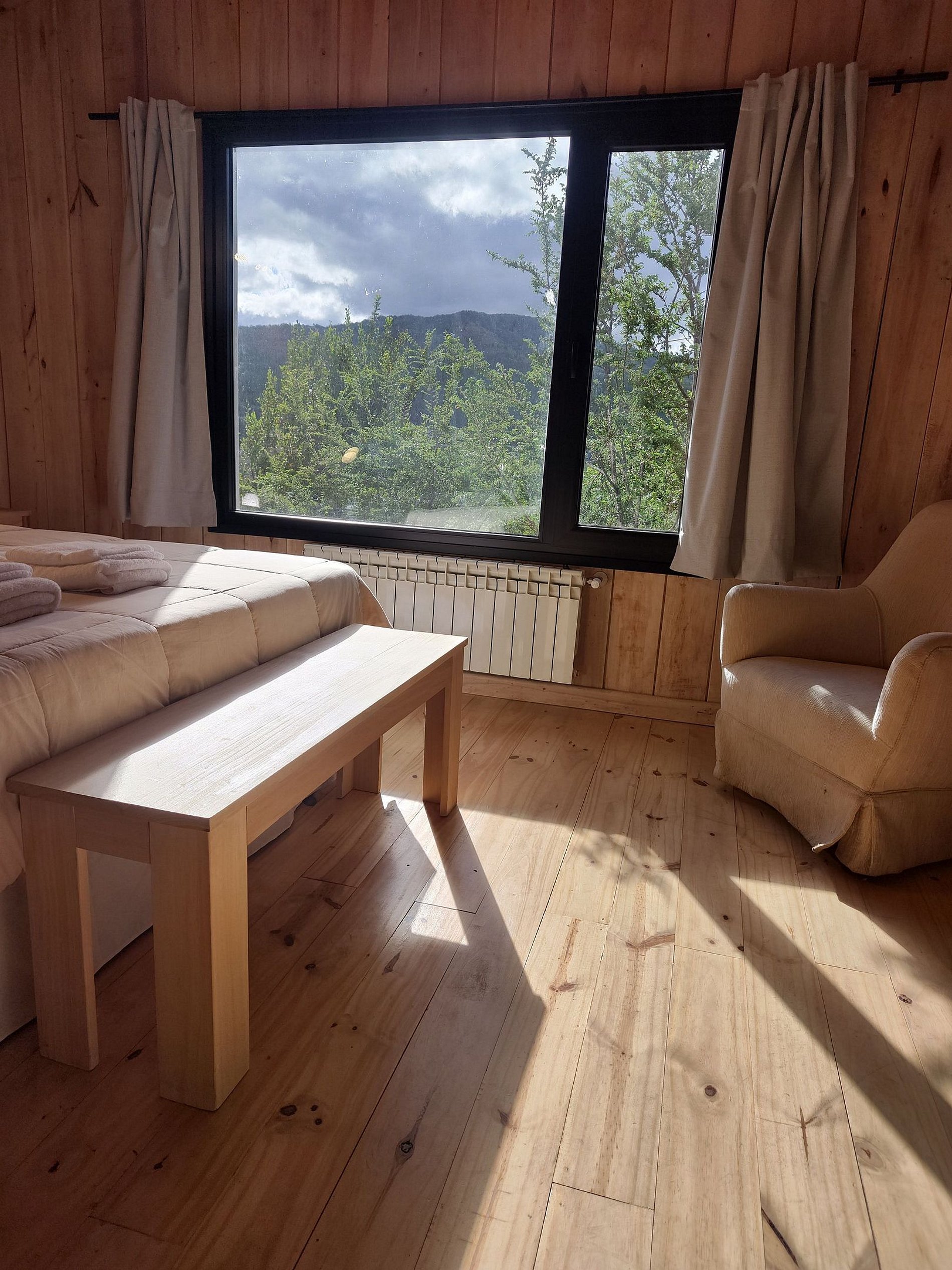 El amplio living con ventanales panorámicos invita a contemplar el bosque y las montañas. La salamandra a leña crea un ambiente cálido ideal para disfrutar las tardes y noches patagónicas.