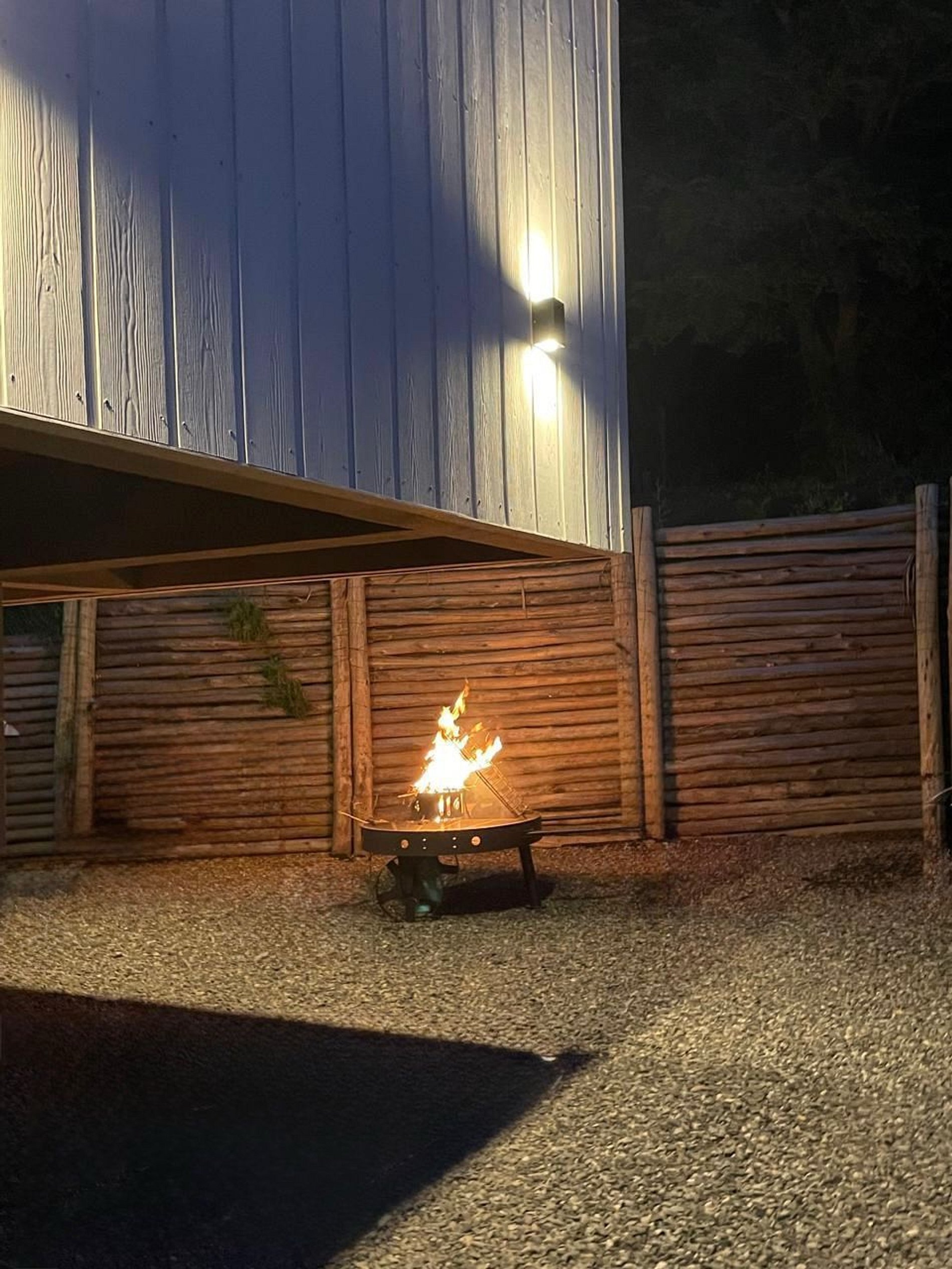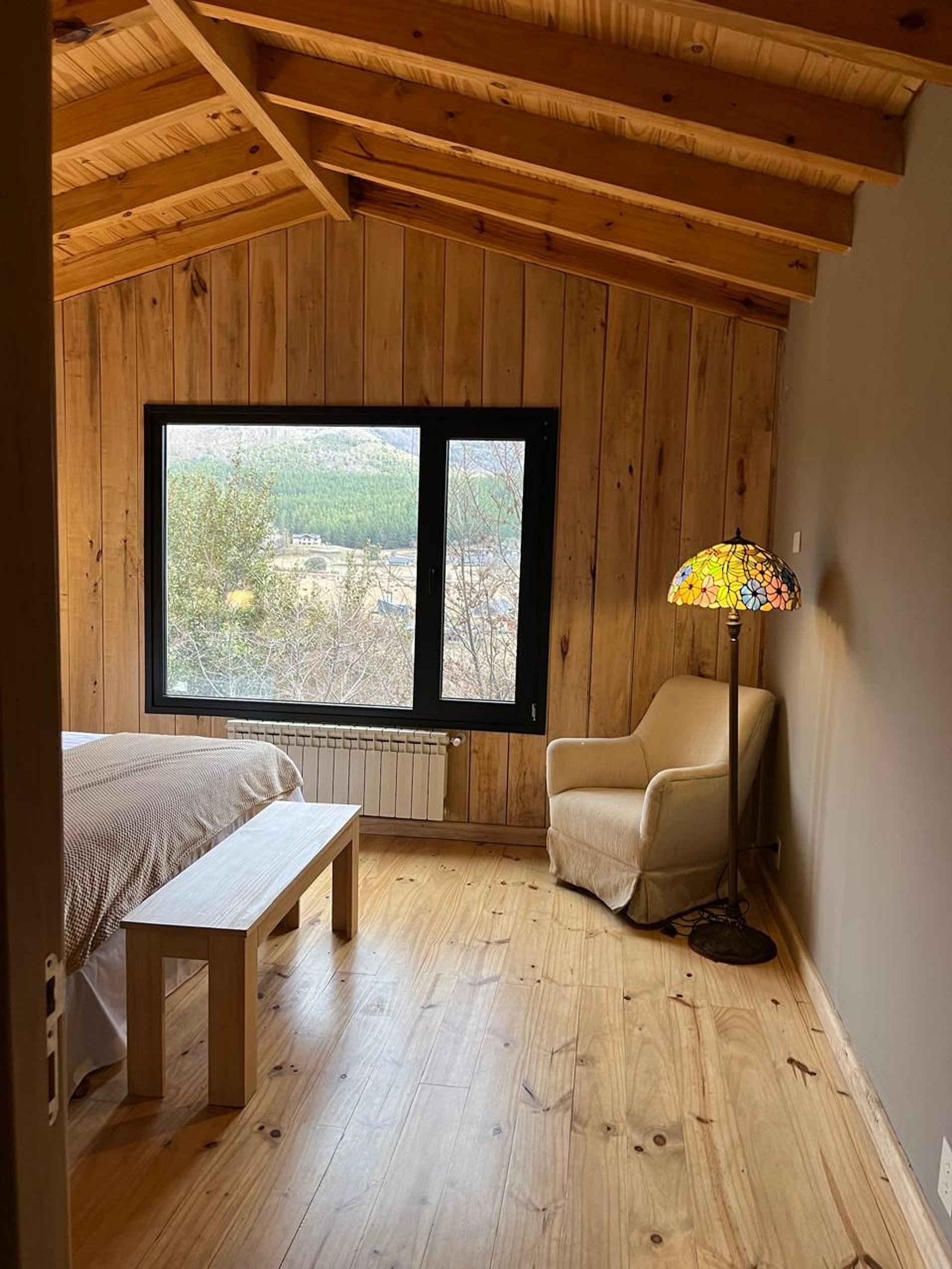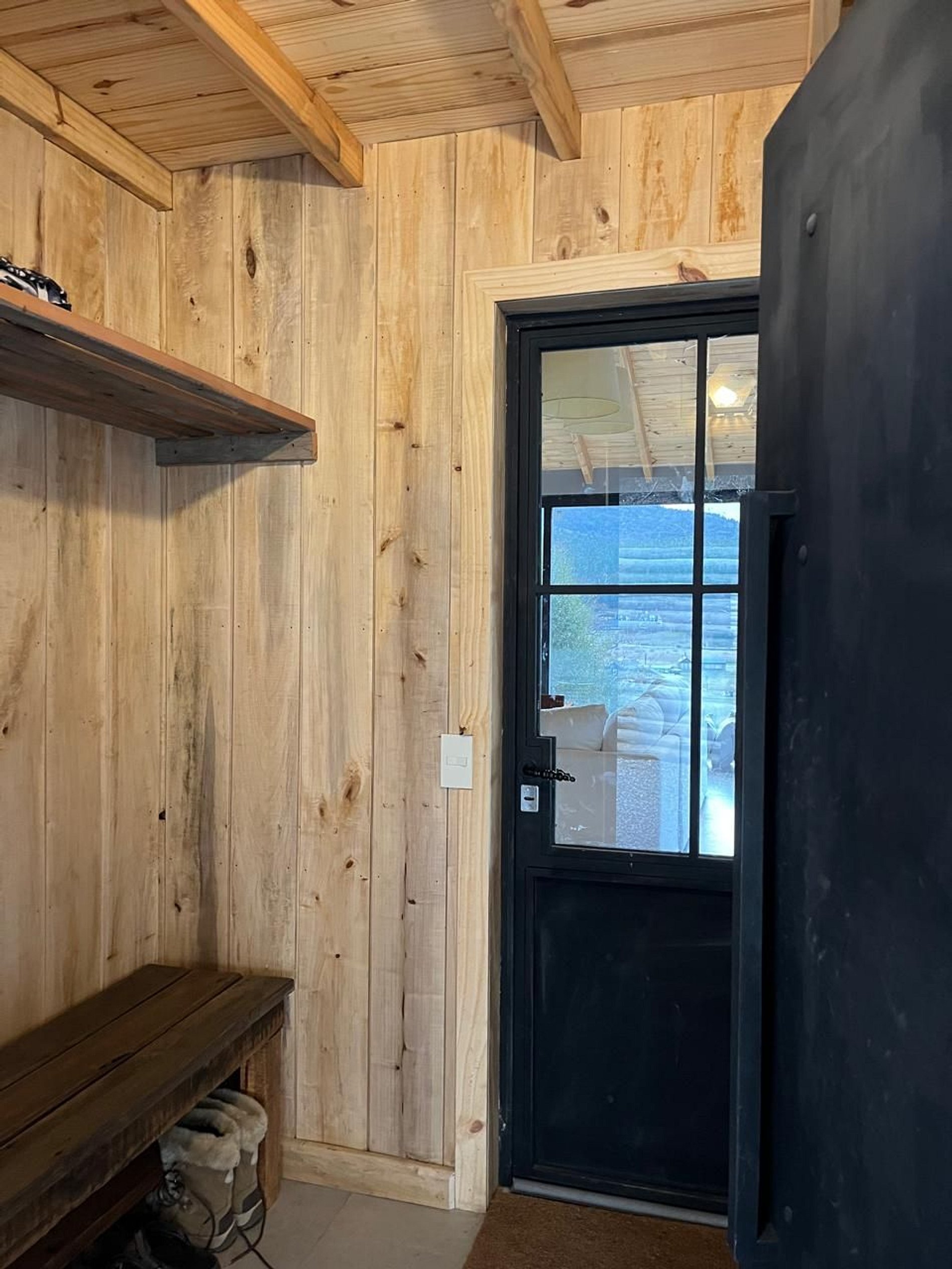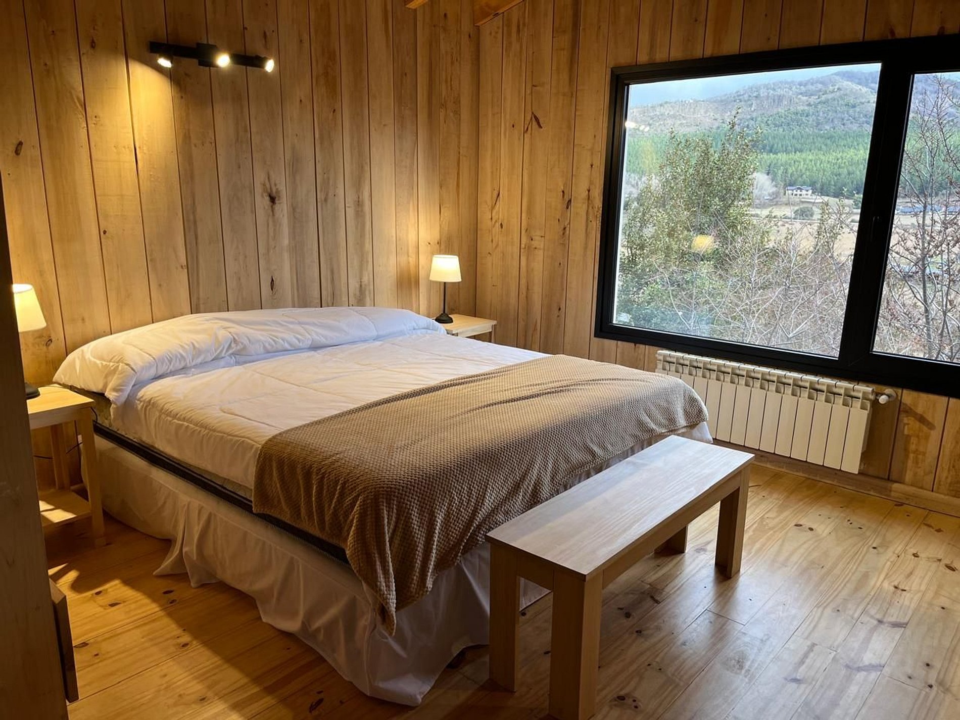 El amplio living con ventanales panorámicos invita a contemplar el bosque y las montañas. La salamandra a leña crea un ambiente cálido ideal para disfrutar las tardes y noches patagónicas.