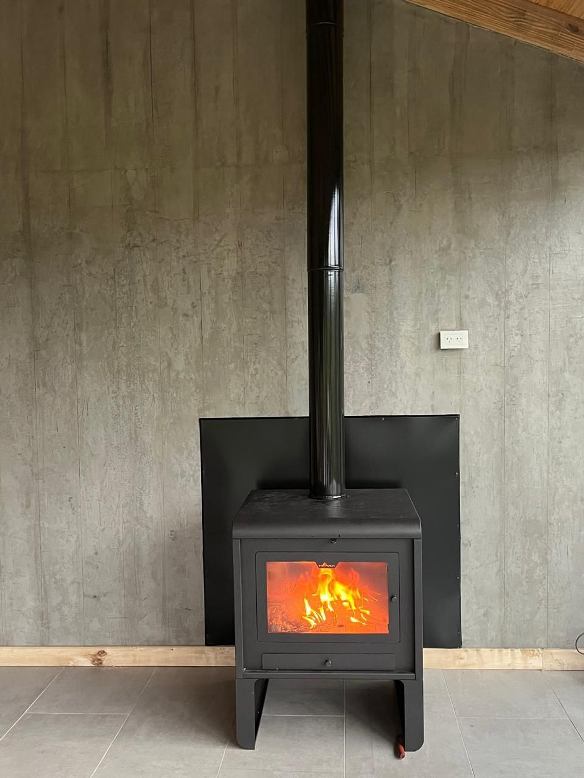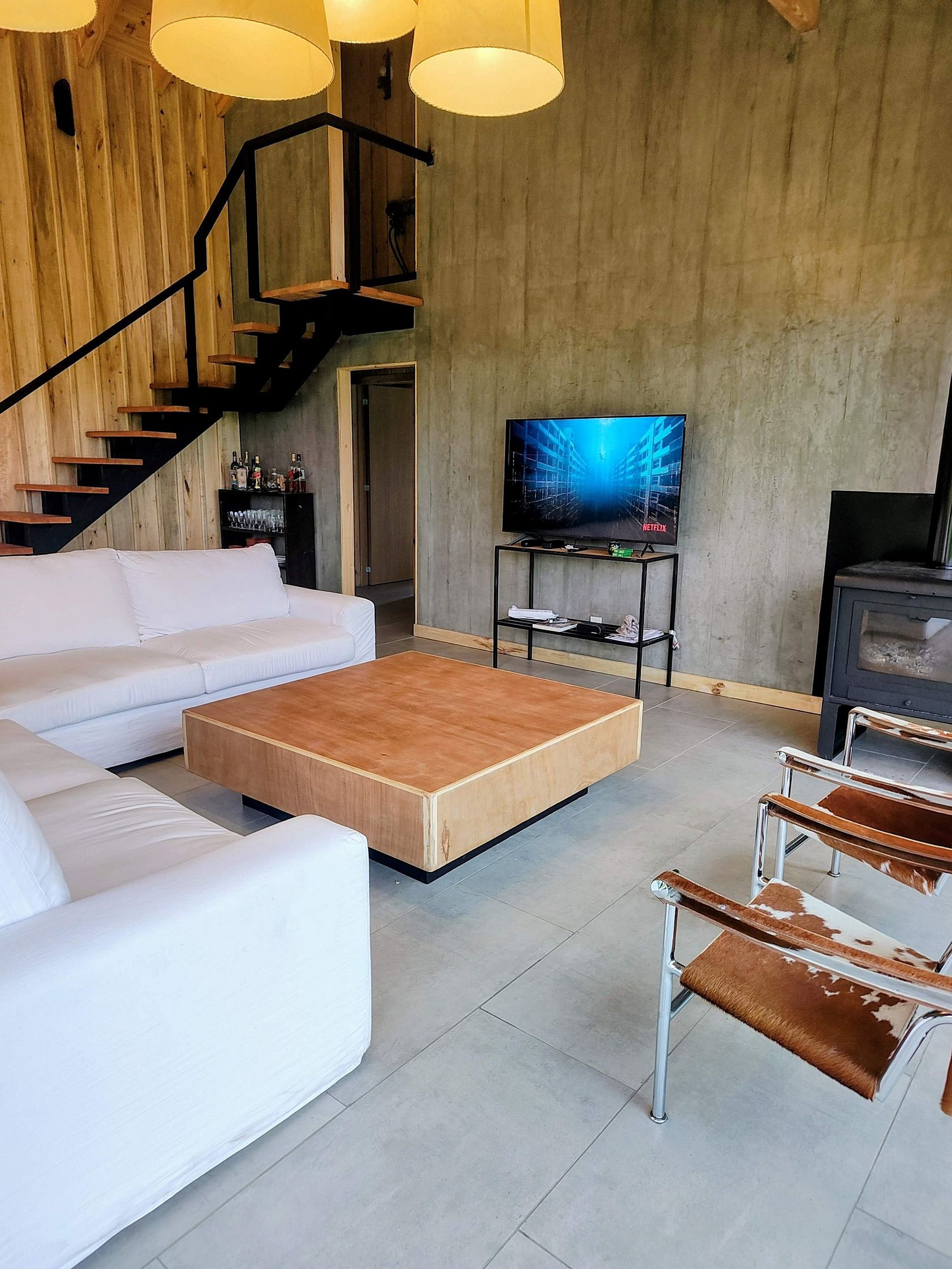 El amplio living con ventanales panorámicos invita a contemplar el bosque y las montañas. La salamandra a leña crea un ambiente cálido ideal para disfrutar las tardes y noches patagónicas.