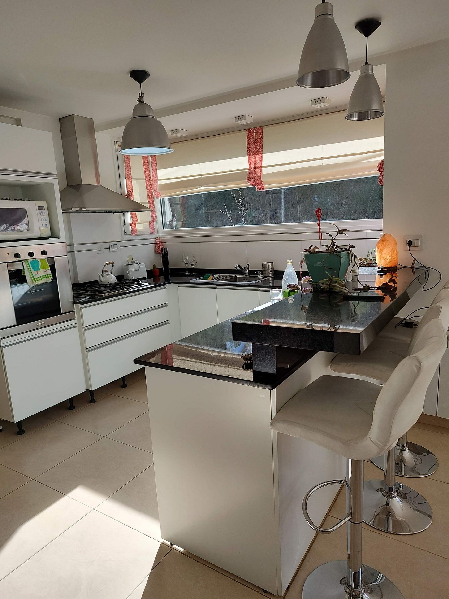 Cocina con equipamiento completo heladera, microondas, cafetera, waflera, tostadora, horno, pava eléctrica.